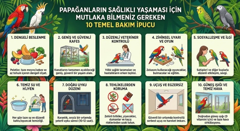 Papağanlar, renkli ve canlı doğalarıyla evcil hayvanseverlerin en sevilen arkadaşları arasında yer alır. Ancak, bu kuşların sağlıklı ve mutlu yaşaması için bazı temel bakım kurallarına dikkat etmek gerekir. Bu makalede, papağanların sağlıklı yaşaması için mutlaka bilmeniz gereken 10 temel bakım ipucunu detaylı olarak anlattık. Bu ipuçlarını uygulayarak papağanlarınızın sağlıklı ve mutlu yaşaması için gerekli koşulları sağlayabilirsiniz.